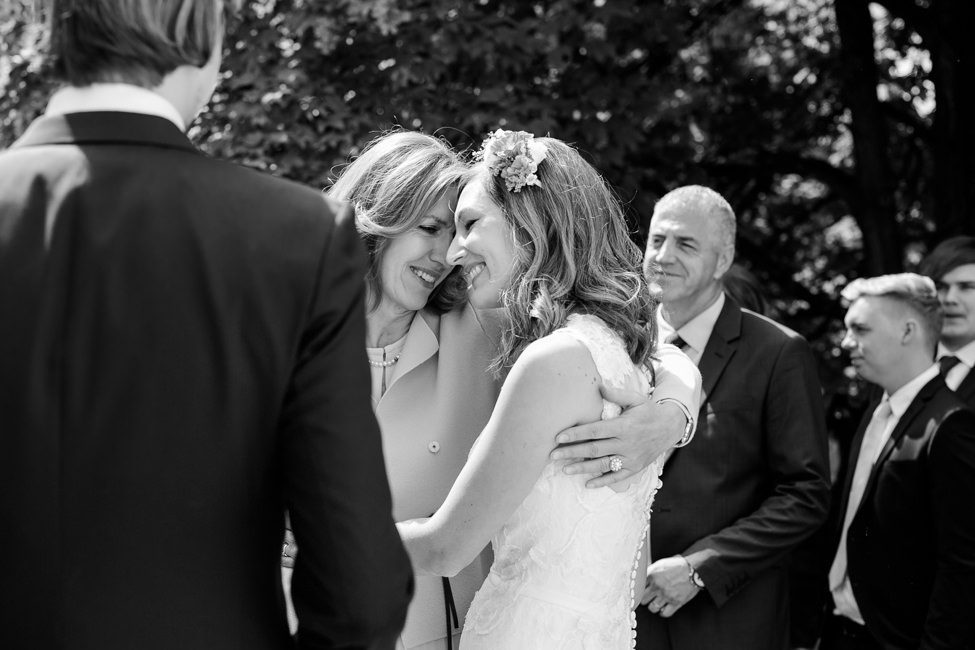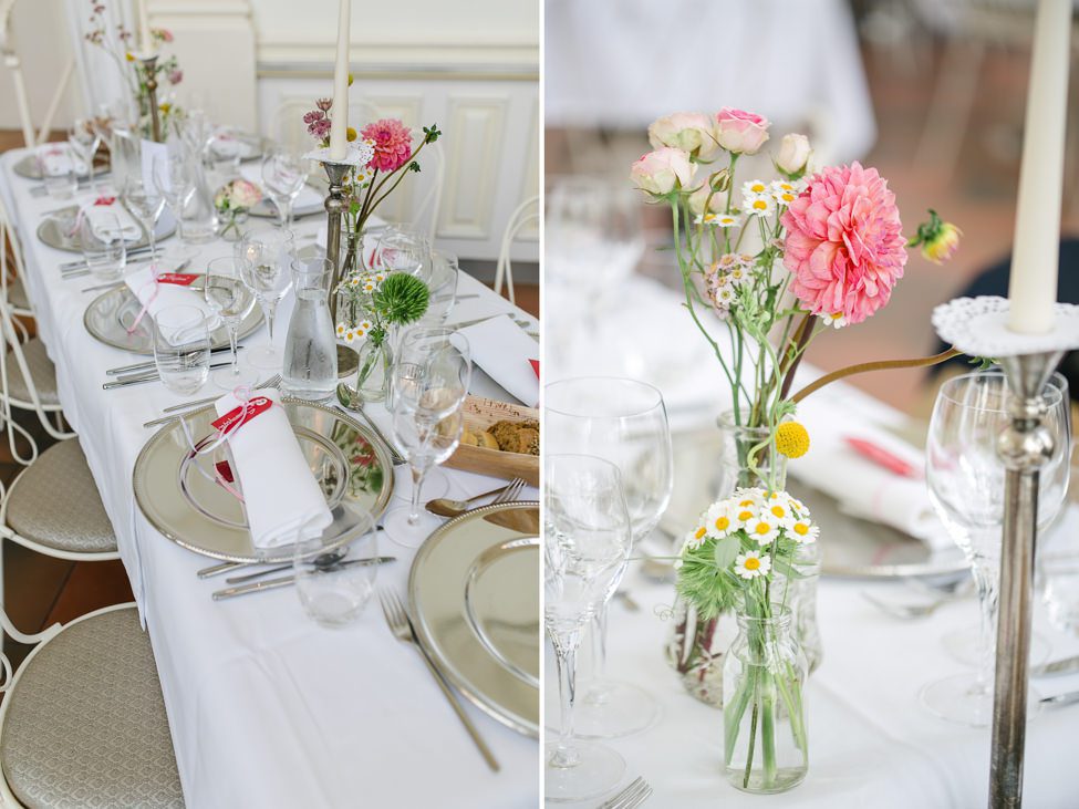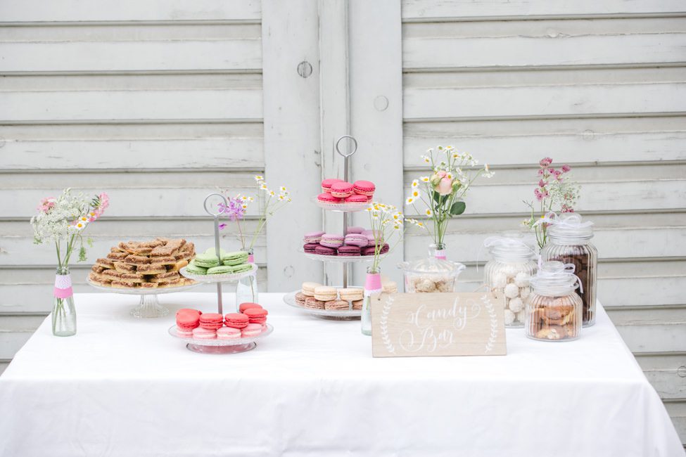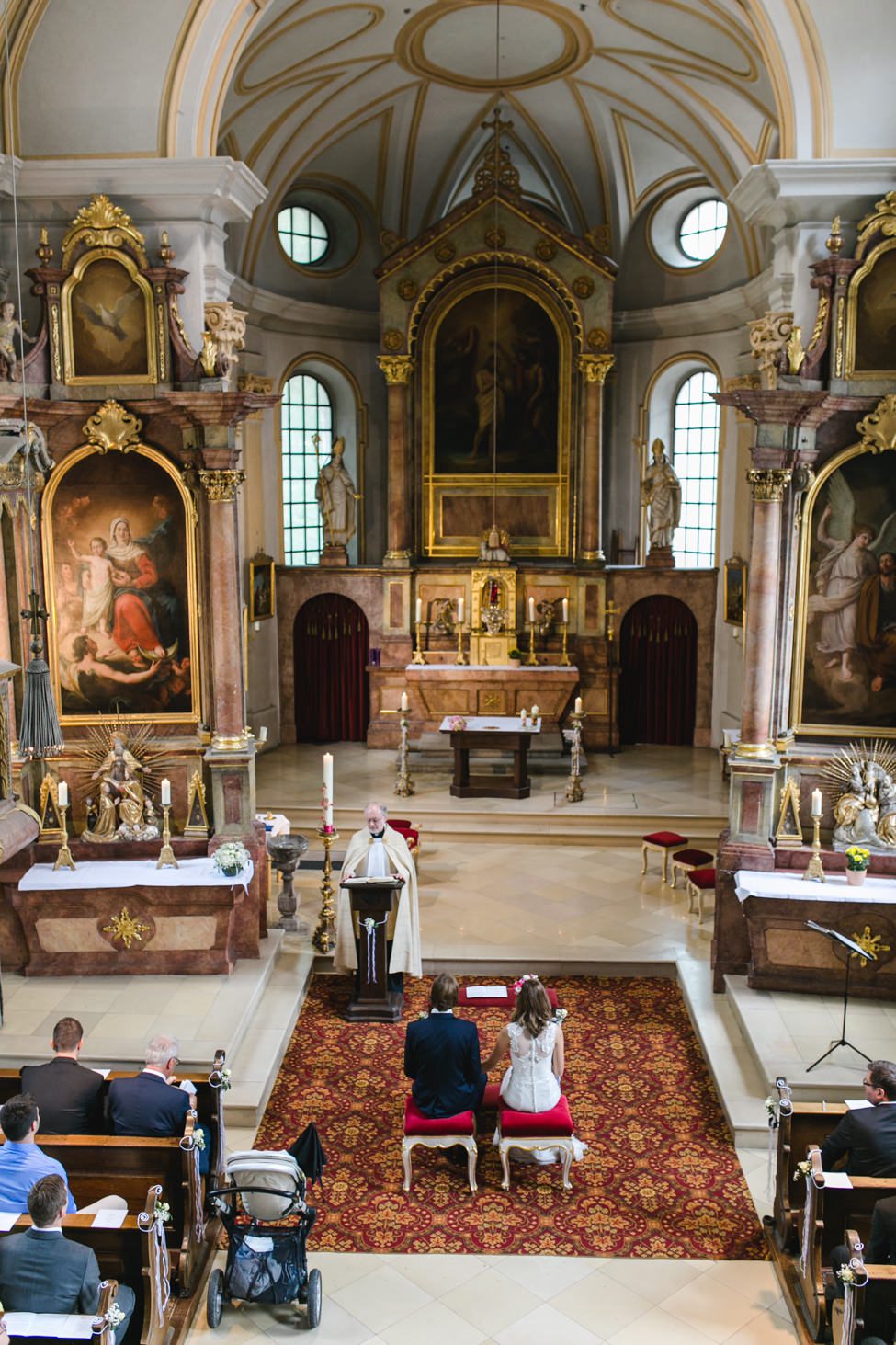 Die Trauung, sowie die Taufe des kleinen Sohnes hat in der alten Haidhauser Kirche in München stattgefunden, dort wurde von den Freunden und Familienmitgliedern auch ein total süßer Sektempfang mit allerlei selbstgemachten Köstlichkeiten organisiert. Die Trauung war sehr persönlich und der Pfarrer hat Trauung sowie Taufe wirklich total schön gemacht – die Taufe war so niedlich. Der kleine Mann durfte auf dem Altar sitzen – selbstverständlich waren alle Gegenstände vor allem aber die Bibel des Pfarrers vor seinen Fingerchen nicht sicher :) Er hat sich aber sichtlich wohl gefühlt dort vorne.